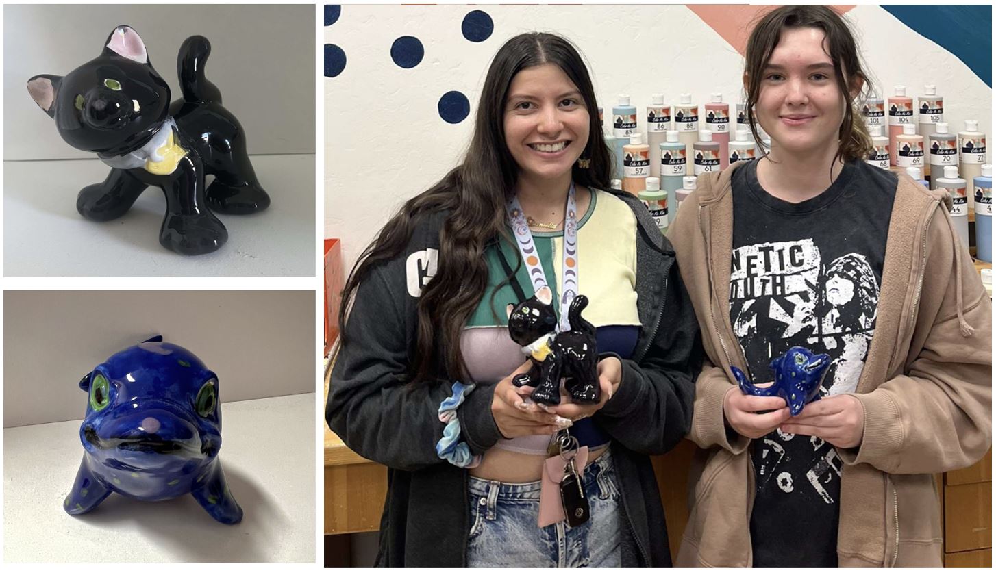They have so many options to choose from, ranging from teacups to huge perched dragons on mountains! For our soon-to-be colorful creations, we chose a cat and a dolphin. And oh man, it was fun! It was like each unpainted piece of pottery was calling our name to be personalized and given a story, so a story we gave it!